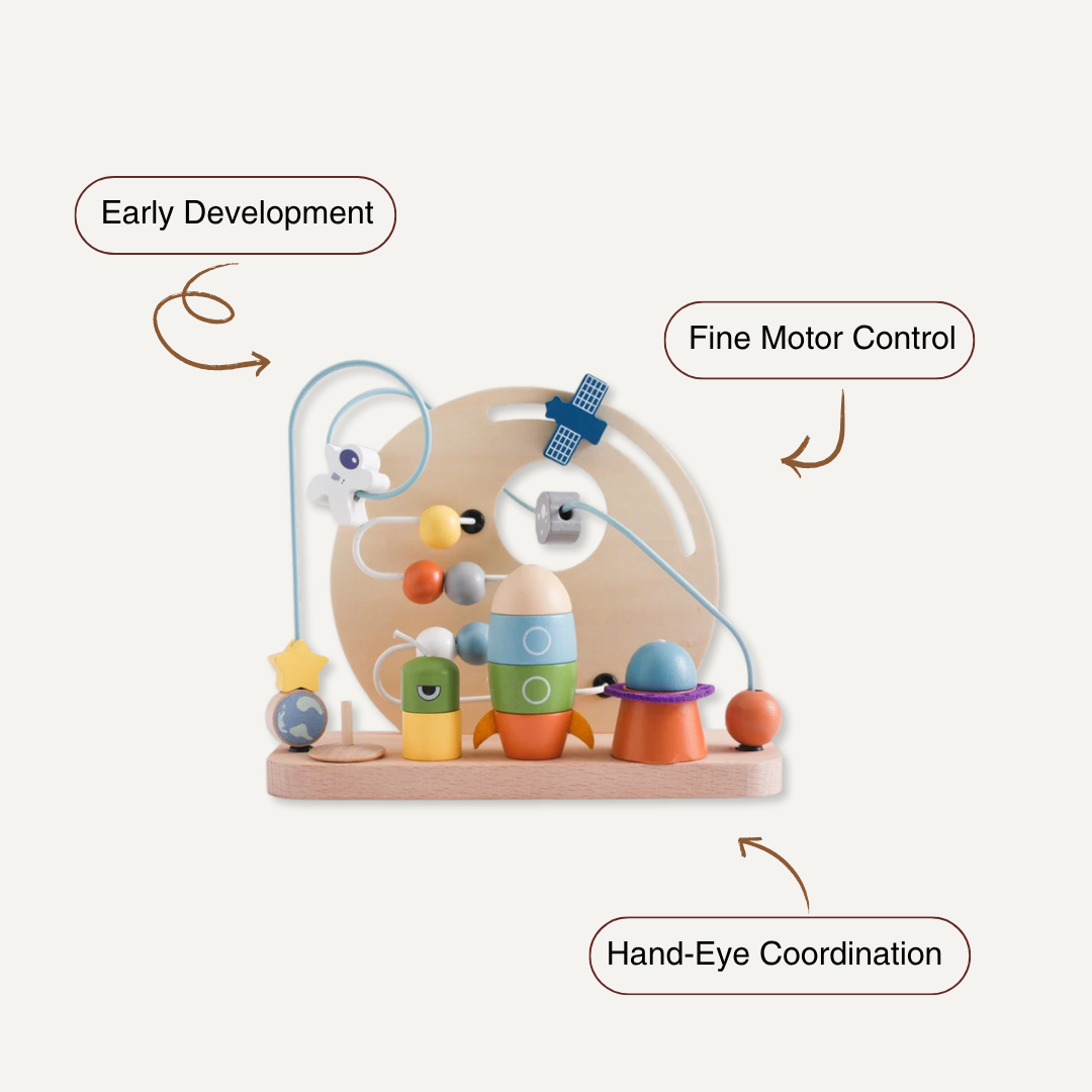 • Wooden bead maze toy with themed shapes like cars and rockets