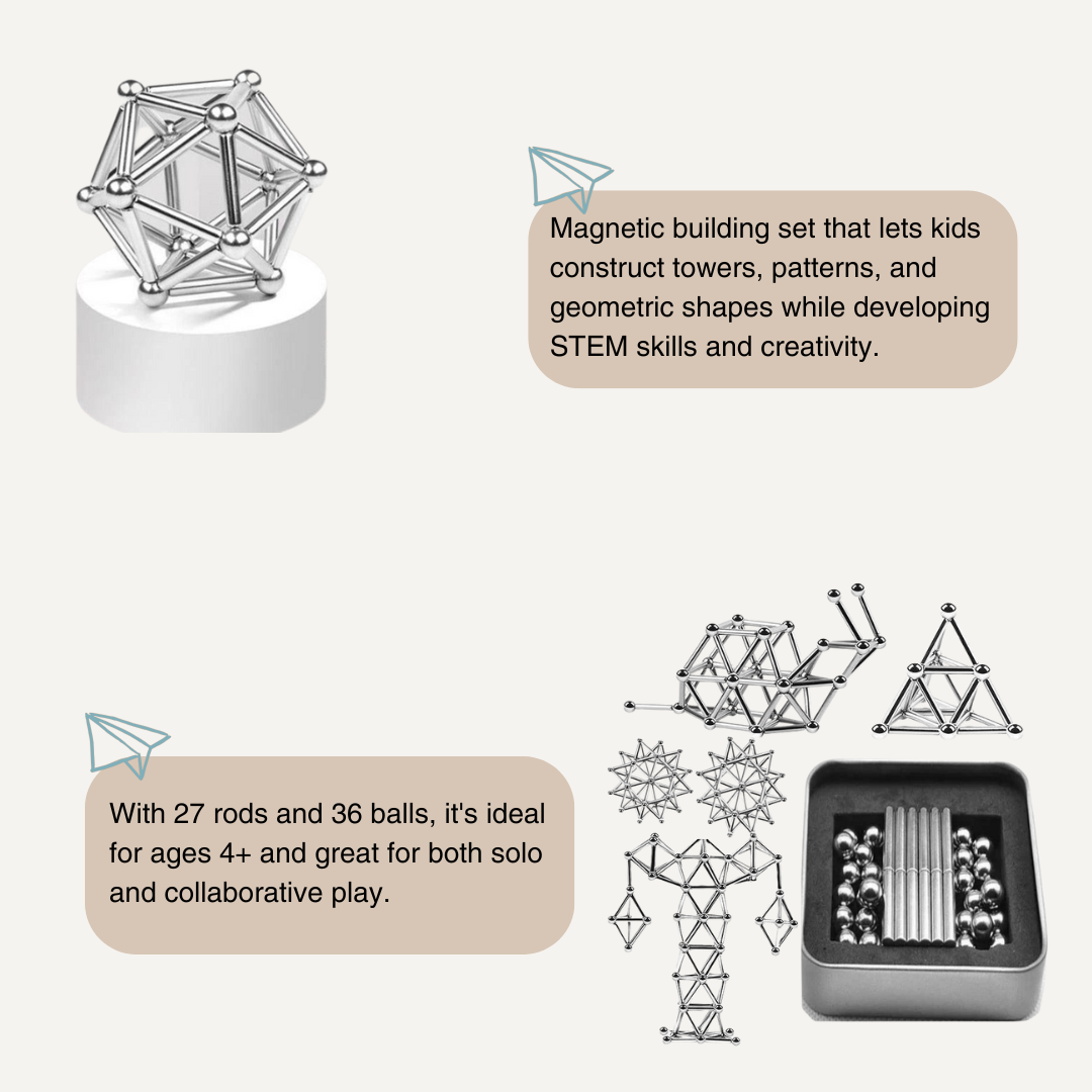 Spark your child’s creativity with MagnoCraft — the magnetic construction set that turns learning into play. With 27 magnetic rods and 36 metal balls, kids can build anything from simple towers to geometric masterpieces, while developing fine motor skills and critical thinking.