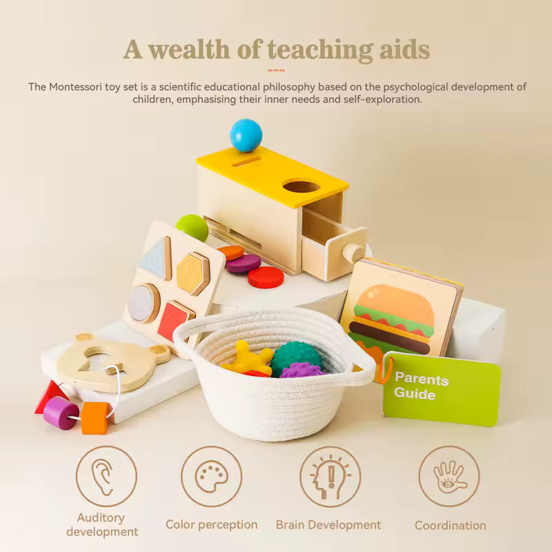 Tailored for babies 0 to 16 months, the Montessori Macaron Play Kit is a charming all-in-one wooden toy set that nurtures early development through sensory exploration and hands-on play. With pastel-hued components including a busy drum, object permanence drawer, and shape/color sorting elements, this kit supports crucial milestones from tummy time to toddlerhood. Every activity is thoughtfully designed to boost brain development, fine motor skills, and independent discovery in the most joyful way. A true Montessori classic—safe, sustainable, and endlessly engaging!