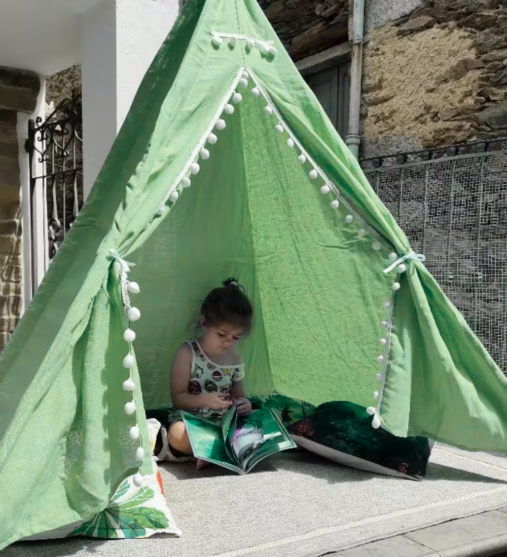 Turn any room or backyard into a magical adventure zone with the Extra Large 71-Inch Kids Teepee Tent! This spacious playhouse features a natural wood frame and breathable polyester fabric in a calming green hue—perfect for reading, pretend camping, or quiet time. Designed to be space-saving yet roomy inside, it's easy to assemble and weather-friendly, making it just as cozy indoors as it is outdoors. A charming window and roll-up door complete the look, giving kids their own little hideaway.