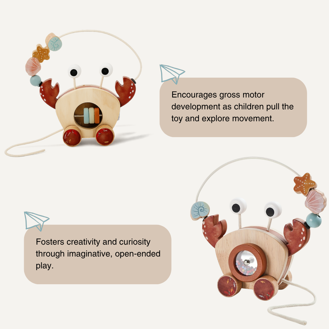 Pull-along crab buddy with fun beads and wobbly wheels—great for walking practice and busy little hands.