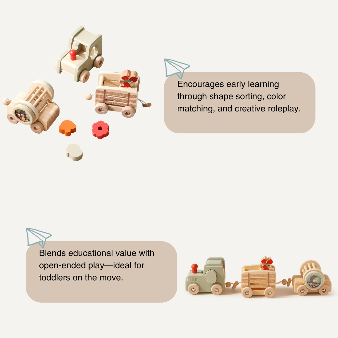 Crafted from natural wood and coated in safe, non-toxic paint. The set includes a squirrel figure, multiple carts with shape sorting functions, and chunky puzzle blocks designed for small hands. Smooth sanded surfaces ensure safe play, while the wooden wheels provide stability for pull-along adventures. Built with quality joinery for lasting use.